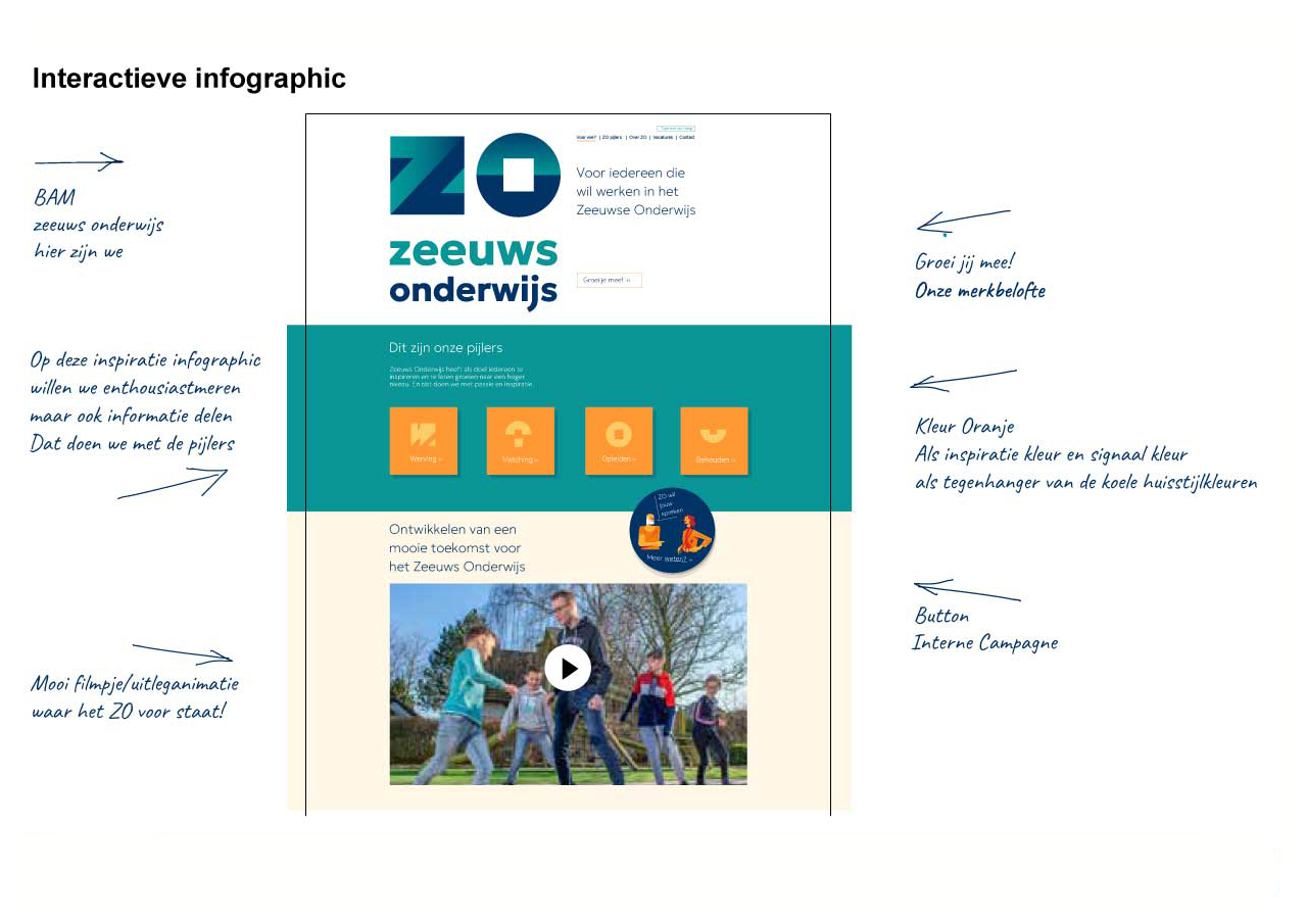 De nieuwe huisstijl en een heldere strategische interactieve infographic brengen de complexe samenwerking in het Zeeuwse onderwijs helder in kaart. Dit visuele instrument zorgt voor een gemeenschappelijke taal en focus op de vier essentiële pijlers: werven, matchen, opleiden en behouden. Hiermee creëren we eenduidigheid en verspreiden we de visie. De infographic is dé tool om Duidelijkheid over samenwerken in het onderwijs van de Zeeuwse toekomst te krijgen!